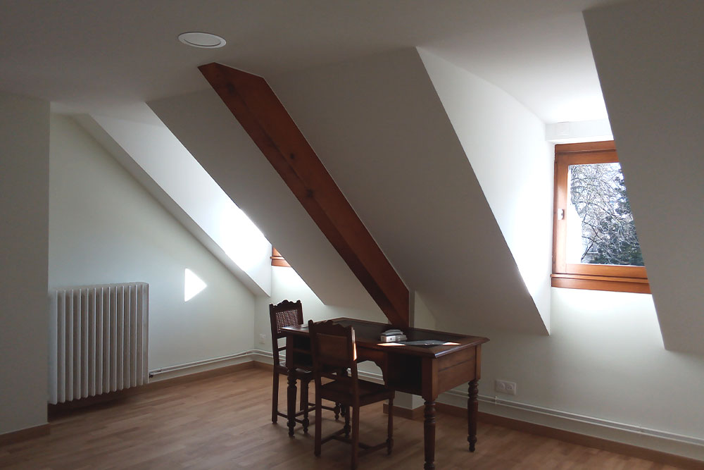 Situé à proximité de la gare d’une ville moyenne, ce logement est apprécié des visiteurs pour de courts séjours. Il s’agit d’un espace unique regroupant l’ensemble des fonctions hormis la kitchenette dissimulée dans un placard et les sanitaires séparés.