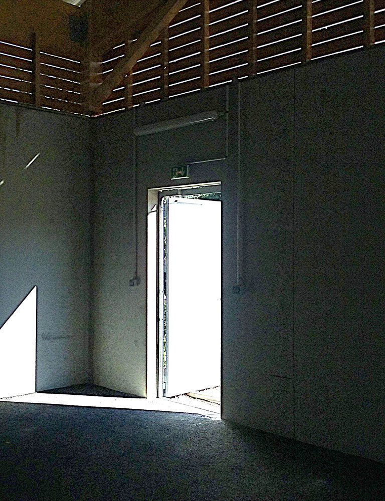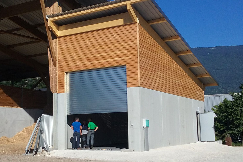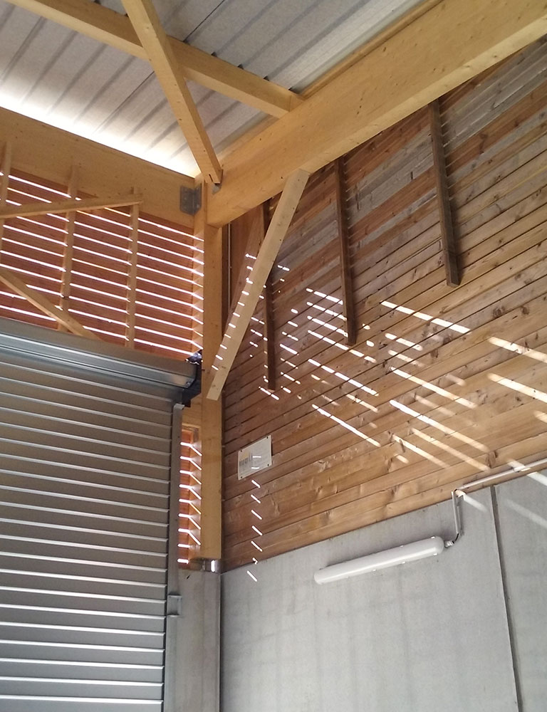 Un bâtiment de type hangar existait déjà sur le tènement. La nouvelle construction s’y accole et en reprend les principes constructifs : Base en béton brut et charpente avec débords et couverture en bac acier. L’espace entre mur et couverture a été comblé par un bardage en bois naturel. Un large rideau métallique assure la perméabilité intérieur/extérieur dans un registre technique fonctionnaliste.